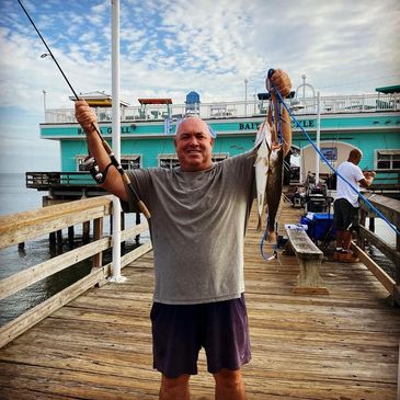 Overlooking the scenic Chesapeake Bay, the Ocean View Fishing Pier offers complete facilities and equipment for everyone who lives and loves to fish. Just off interstate 64 in Norfolk, Virginia, the Pier stretches out 1690 feet into the bay into one of the east coasts most bountiful fishing grounds. Located on site are a tackle shop with snack bar, a restaurant, and restrooms. It is also equipped for catered parties, receptions and banquets for groups up to 500 people. So hang up your gone fishin' sign and cruise on over to Ocean View Fishing Pier for a days catch, or relax on our upper deck with music, good company and exquisite panoramas of America's most beautiful Bay. You might want to bring your camera! At Ocean View Fishing Pier the living is easy and yes the fish are jumping. Summer time and all the time. Call us for current fishing hours & Chesapeake Bay Fishing Report!